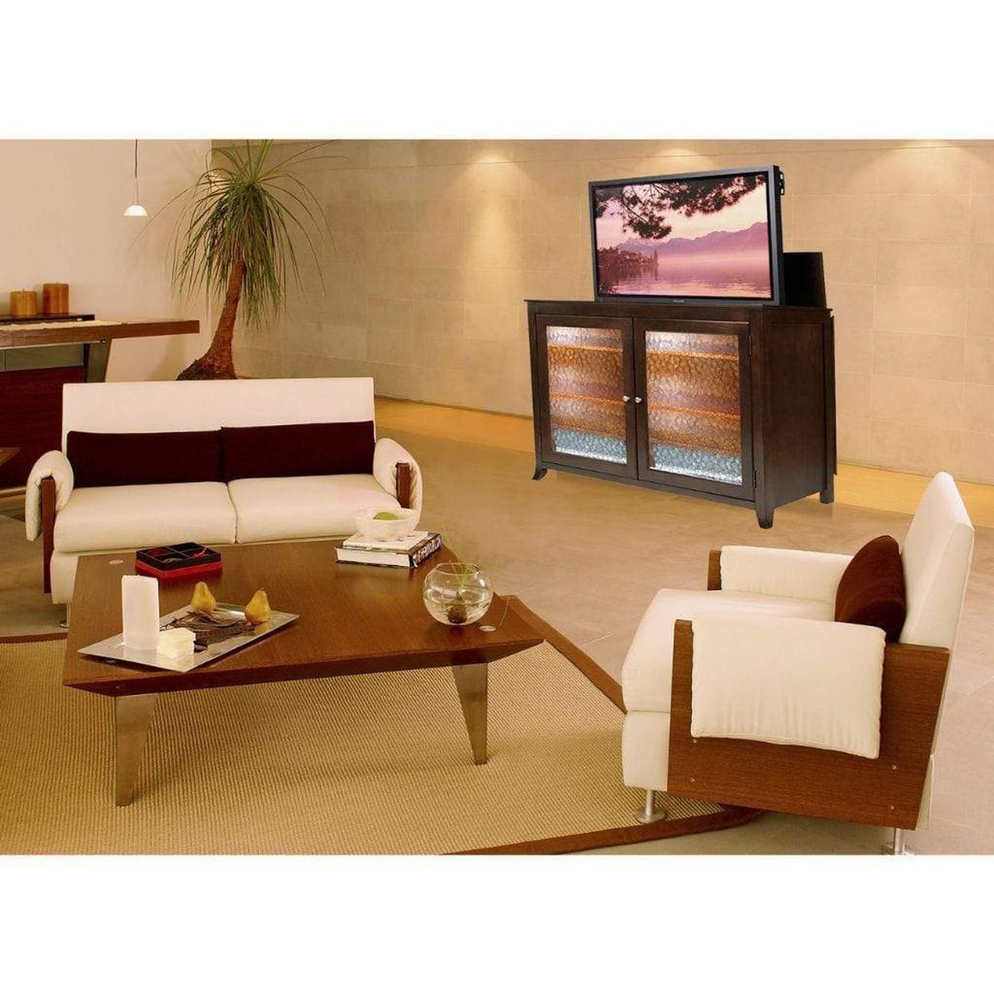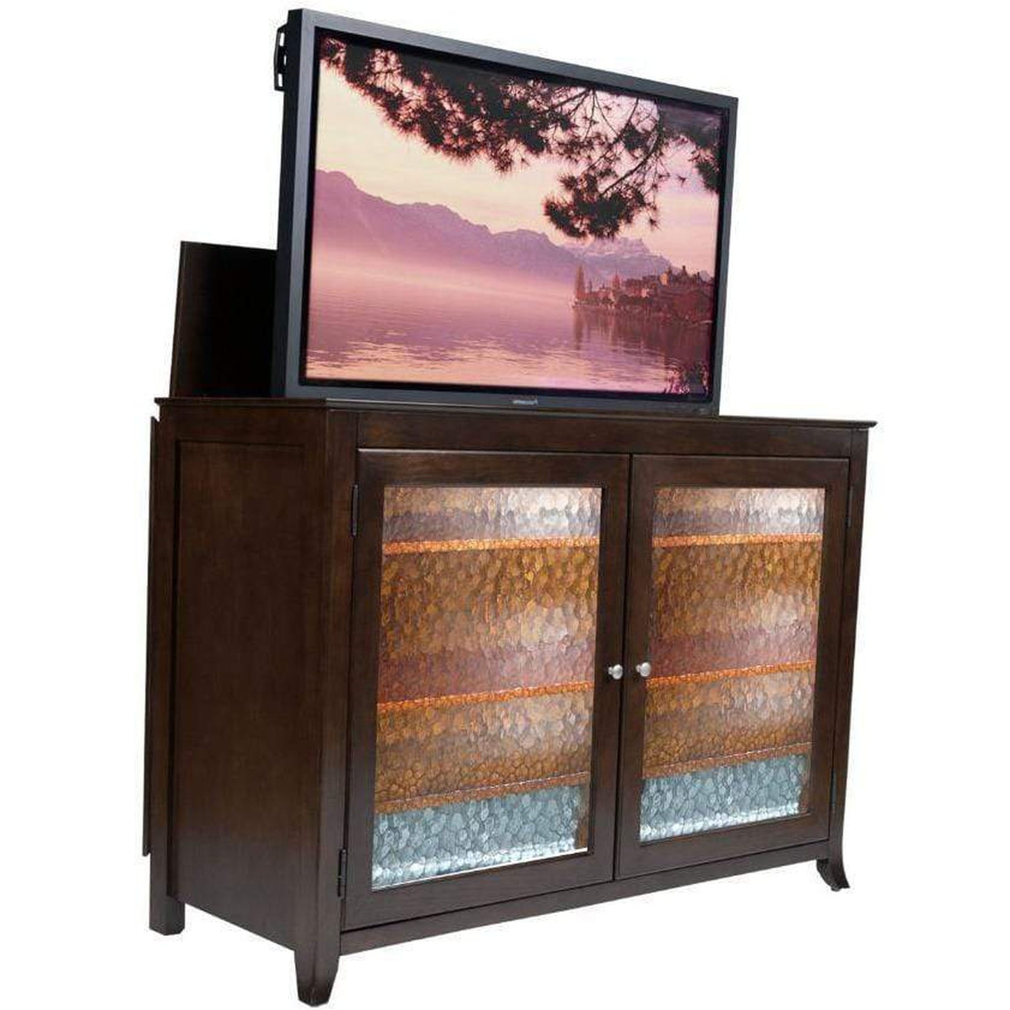 The Carmel TV Lift cabinet features crisp lines and a rich espresso finish just like our Monterey TV lift cabinet. This model features beautiful wavy glass on the front facing door panels making it a versatile entertainment center which complements a variety of decorating tastes.