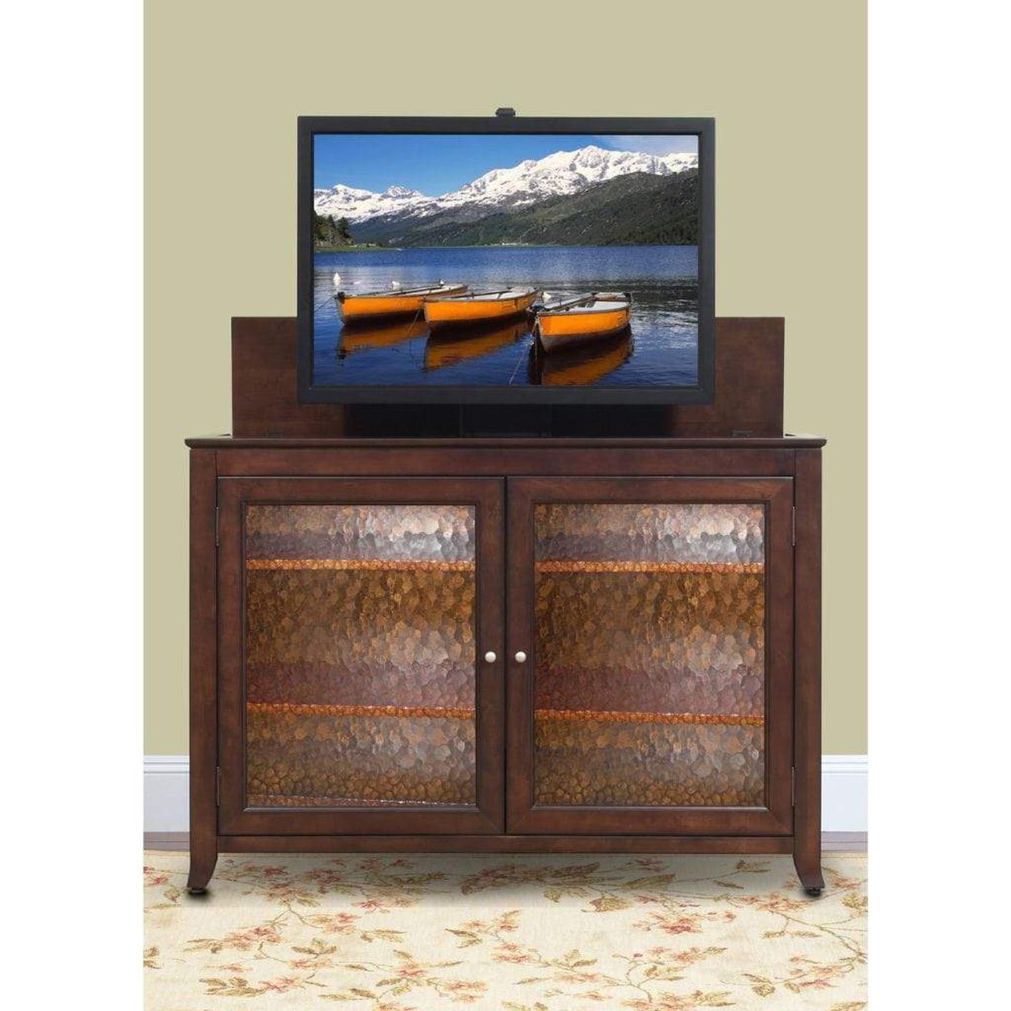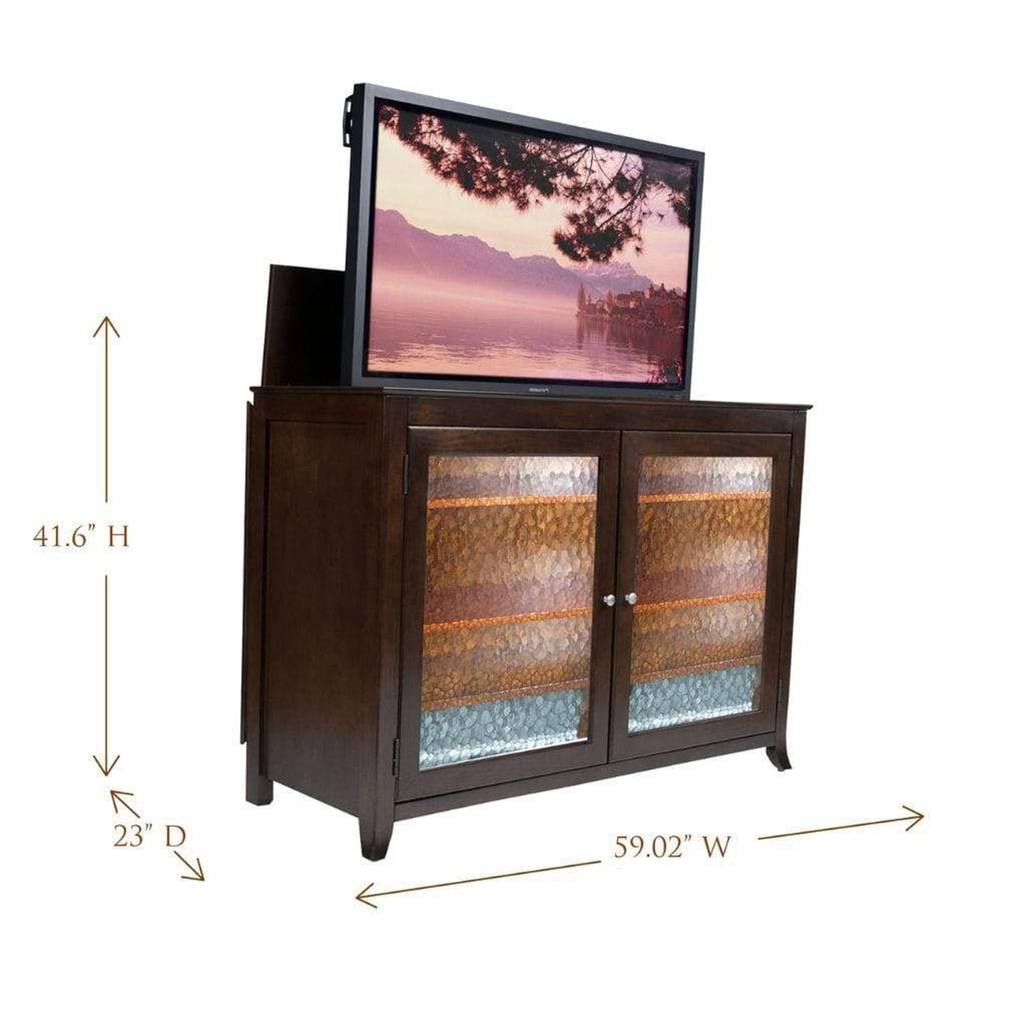 This heirloom-quality cabinet with quiet, smooth electro-mechanical lift accommodates plasma and LCD TVs up to 55" wide by 32.5" tall and 4.5" deep. It features solid birch with espresso veneers with wavy glass panels. The Carmel comes IR ready allowing access to components via remote control behind the wavy glass doors.