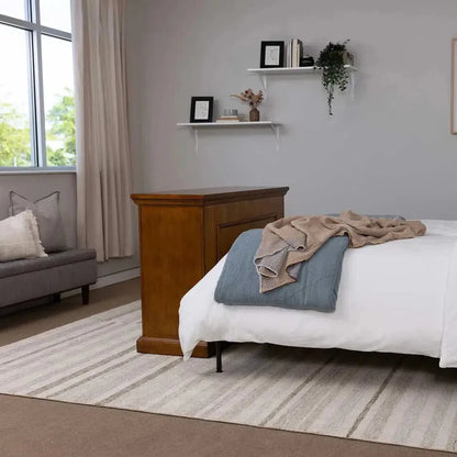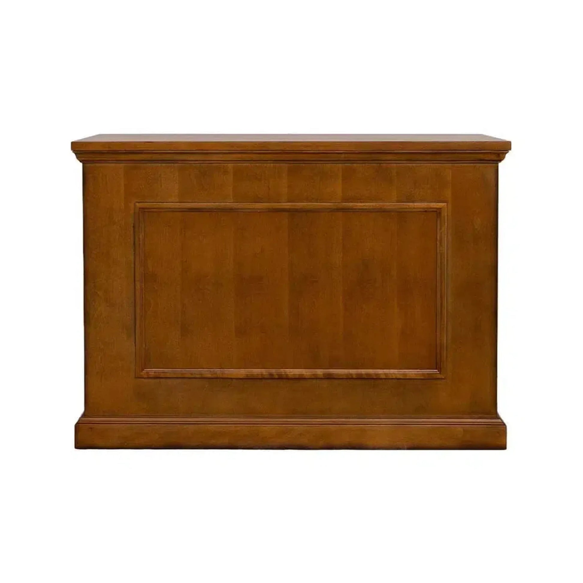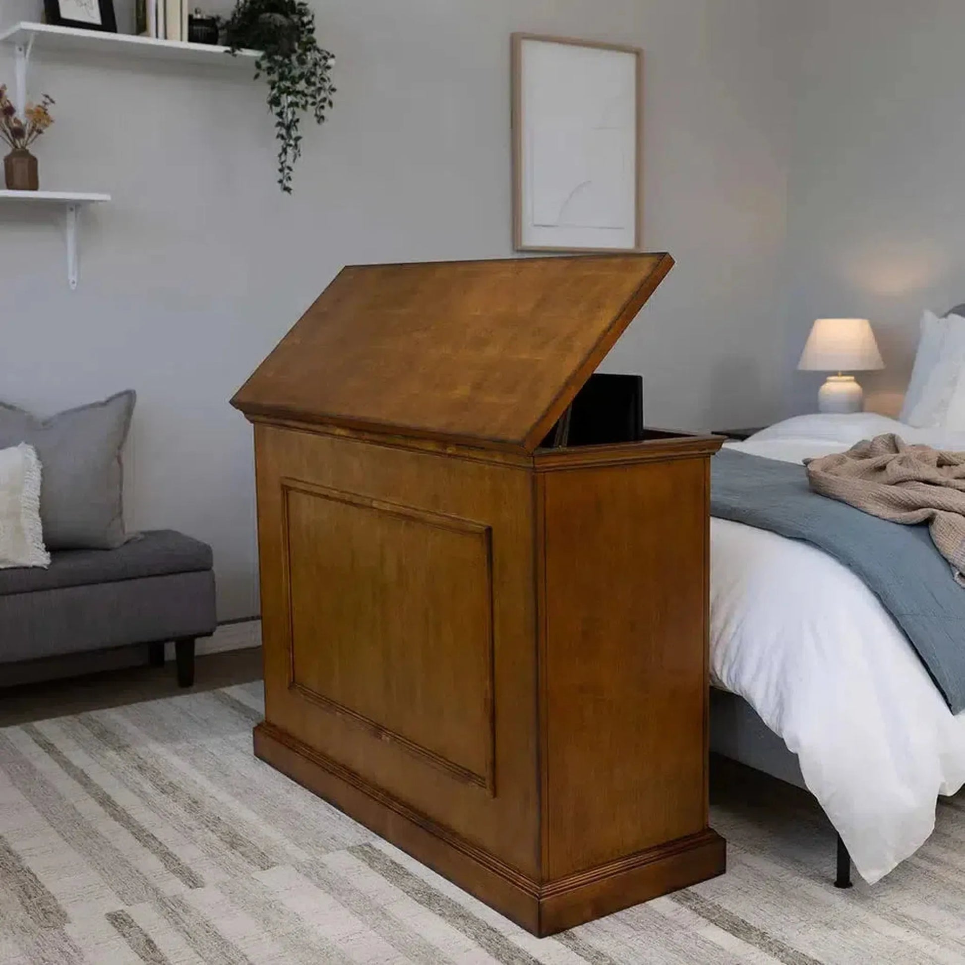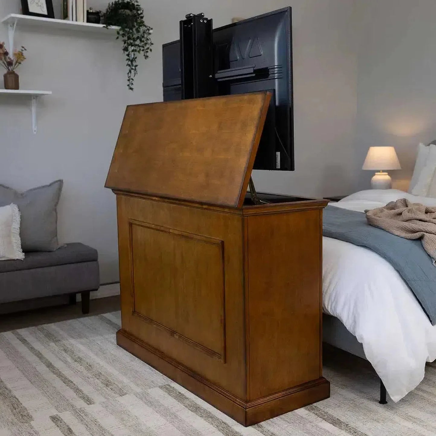 This inexpensive, yet high-quality pop-up TV cabinet is optimized for usage at the foot of the bed. The Elevate® cabinet gives you the option of hiding your flat screen TV to function as an exquisite wood chest or elevating your television to an optimal height for watching your favorite shows in bed. While ideally designed for the bedroom, The Elevate® Honey Oak features a four-sided finish which makes it a flexible piece that can be placed virtually anywhere in your home.